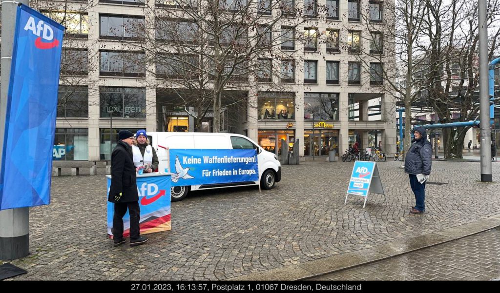 Während Baerbock (GRÜNE) davon spricht, dass Deutschland einen Krieg gegen Russland führe und die größten deutschen Medienanstalten sehr milde mit dieser Aussage umgehen (das ZDF sprach von einem „verrutschten Statement“), stehen Angehörige des AfD-Kreisverbandes Dresden am Postplatz, um für Frieden und Diplomatie einzustehen. Diese Frau gefährdet unser aller Sicherheit und muss deshalb schleunigst zurücktreten, bevor […]