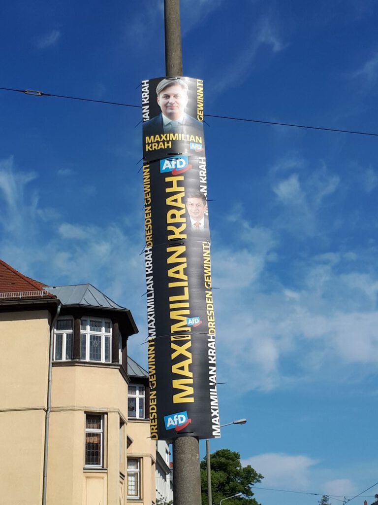Bekanntermaßen hat die Stadt Dresden die Plakate unseres OB-Kandidaten Maximilian Krah — bekannt als „Langer Max“ — teilweise beseitigt. Die Korrespondenz mit der Stadt hierzu läuft noch mit dem AfD-Kreisverband Dresden, zuletzt auch anwaltlich. Seit einigen Tagen gibt es eine weitere Plakatserie unseres Kandidaten, welche die von der Stadt monierten, angeblichen Verstöße gegen die Wahlwerbesatzung […]