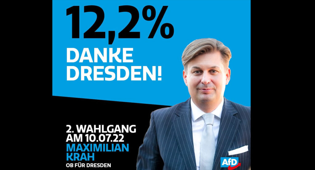 Gerne lade ich Sie ein, meine Kampagnen-Webseite zu besuchen. Meine Positionen und mein Programm für Dresden finden Sie unter: www.dresden-gewinnt.de Maximilian Krah Auch in der zweiten Runde der Oberbürgermeisterwahl setzt die AfD auf Dr. Maximilian Krah als Kandidaten. Dieser kommentiert seine Entscheidung wie folgt: „Der einzige Unterschied zwischen Hilbert und Jähnigen besteht doch nur […]