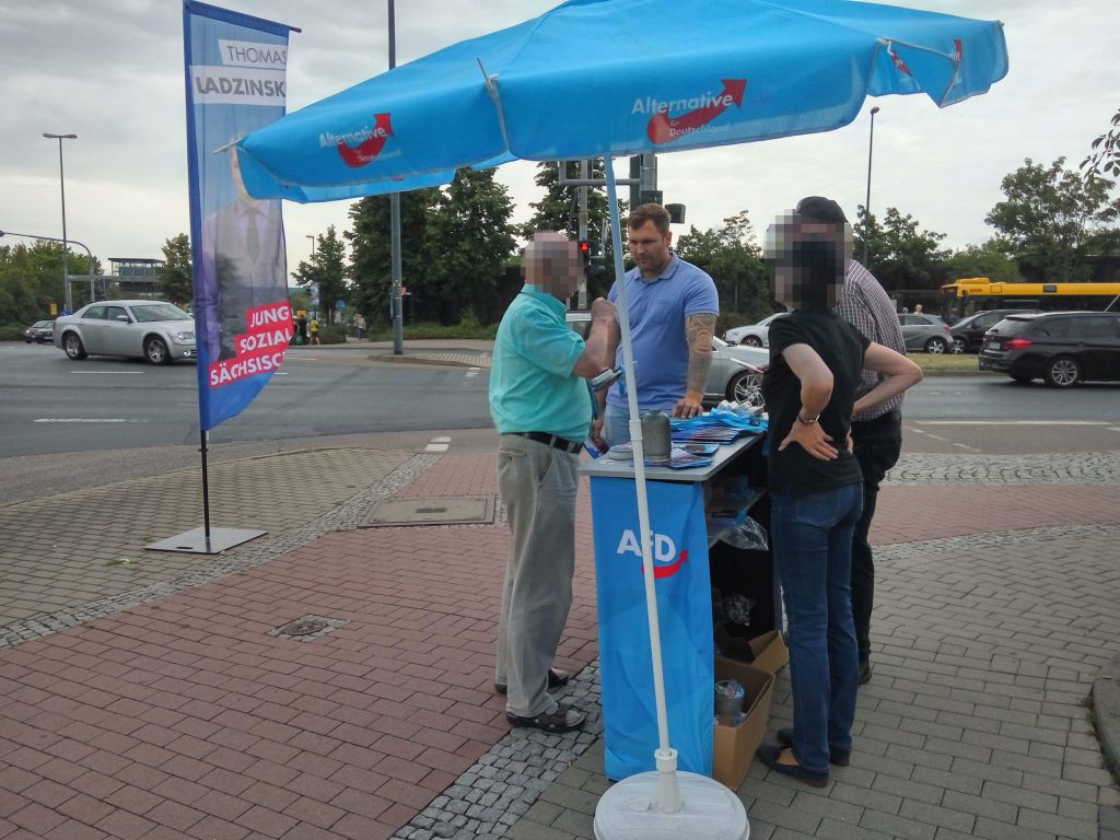 Der Dresdner Kreisverband und besonders die Direktkandidaten stehen voll im Wahlkampf, hier am Sonnabend, dem 10. August 2019, mit einem Infostand von Thomas Ladzinski vor dem Kaufpark Nickern. Die Wahlkämpfer waren begeistert über die Zustimmung der Passanten. Viele Bürger sagten geradeheraus, dass sie die AfD wählen werden. Wenn am AfD-Stand einmal Ablehnung geäußert wurde, dann […]