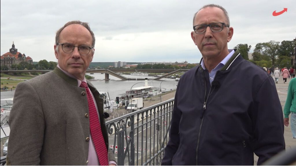 Der Landesvorsitzende Jörg Urban & Stadtrat Bernd Lommel stellen Fragen zum Einsturz der Carolabrücke