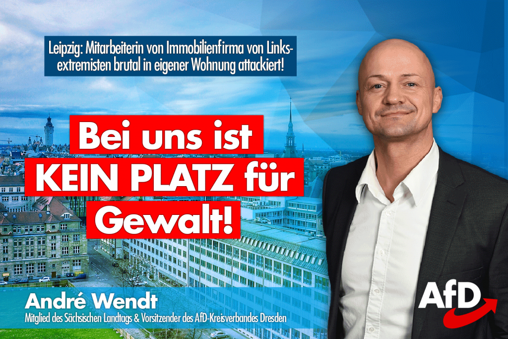 Leipzig: Linksextremisten attackieren Mitarbeiterin von Immobilienfirma In Leipzig haben mutmaßlich Linksextreme die Mitarbeiterin einer Immobilienfirma in deren eigener Wohnung überfallen und verprügelt. Auf einer linksextremen Webseite bekannte sich eine „Kiezmiliz“ zu der Tat. Dazu André Wendt, sächsischer Landtagsabgeordneter und Kreisvorsitzender der AfD Dresden: „Es ist bereits bekannt, dass sich linksextremistische Gewalt nicht nur gegen Sachen […]